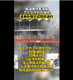 4月19日22:07,由威海驶往大连的“中华富强”号客货滚装船行驶途中发现舱内一辆货车出现冒烟现象,随即返航威海港。威海市相关部门迅速启动应急响应,对船上旅客、船员进行妥善疏散安置。4月20日11时40分许,在救援过程中,发生爆燃,现场无人员伤亡。现场处置工作正抓紧进行,事故原因在调查中。363636.jpg目前,威海市相关部门已疏散全部旅客和船员,现场无人员伤亡,相关处置工作正在进行中。截至20日20时,山东消防救援总队已调集44辆消防车、183名指战员、5台机在现场处置;并调集6台消防机器人赶赴现场增援。